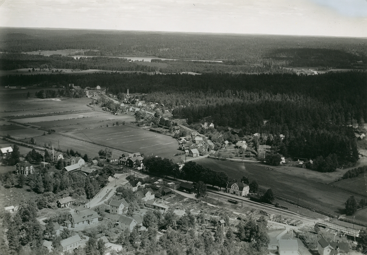 Flygfoto över Mörlunda med järnvägsstationen.