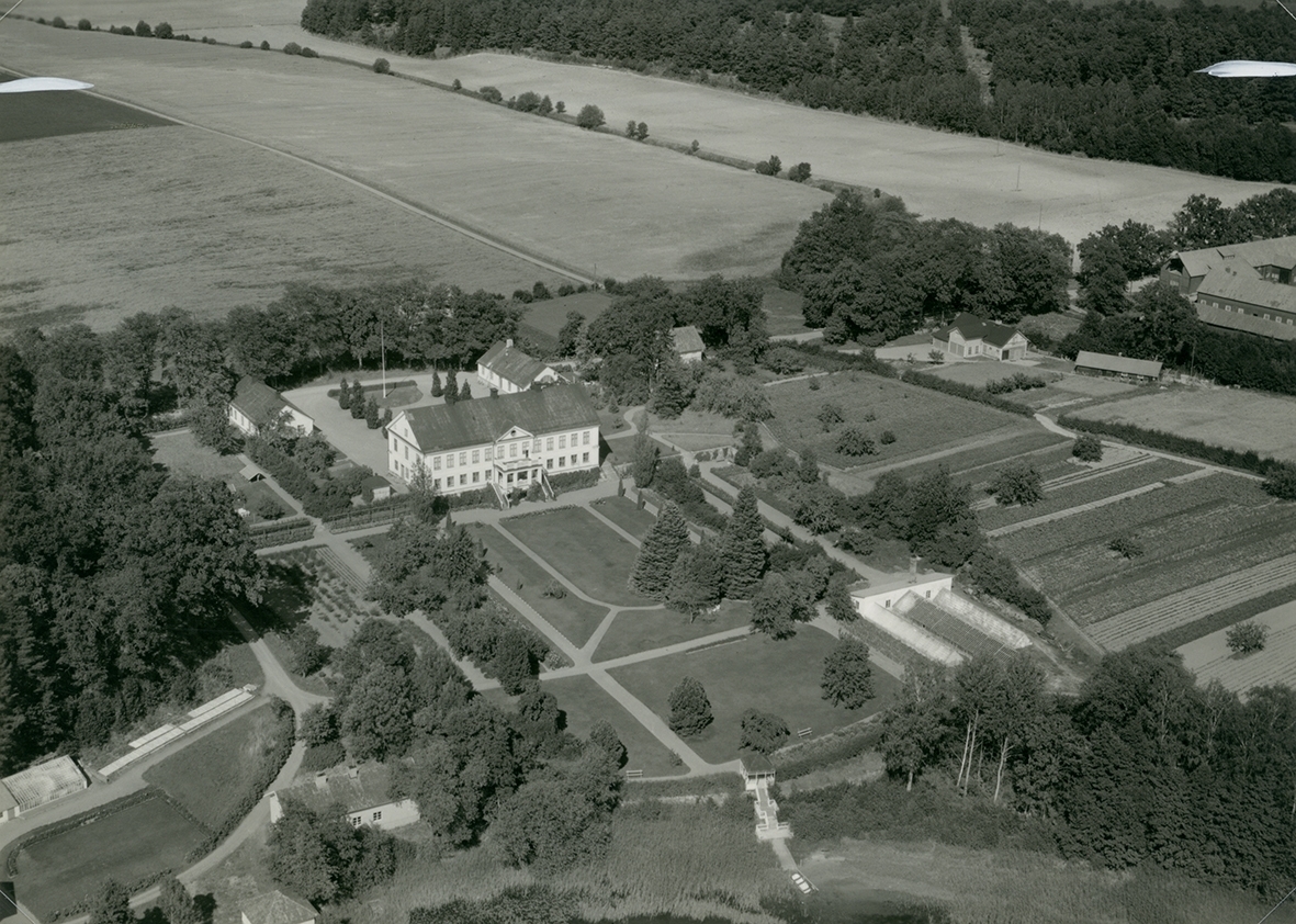 Flygfoto över Odensviholm herrgård. De två bilderna visar dels den obeskurna kopian, dels det beskurna vykort som blev resultatet.