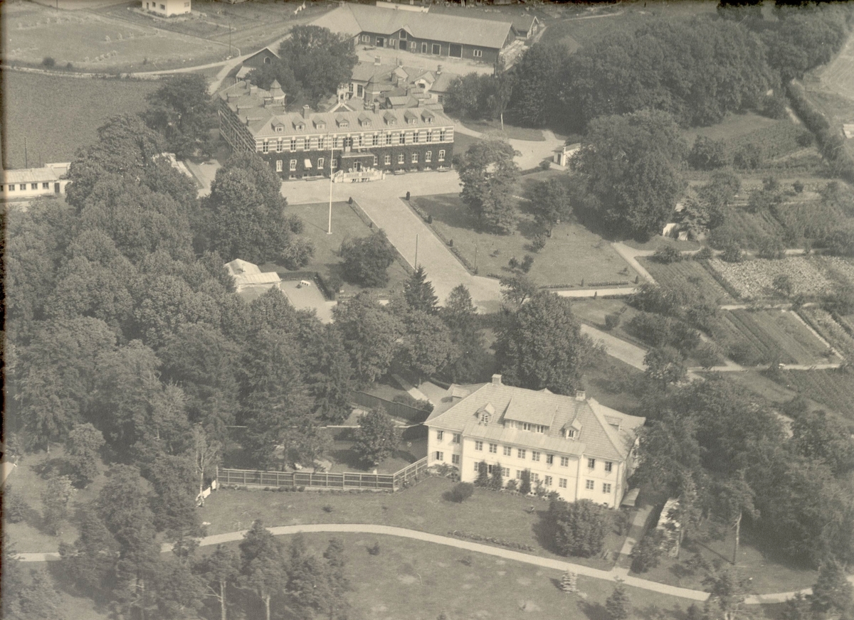 Flygfoto över Kalmar ålderdomshem med två tillhörande sjukhus.