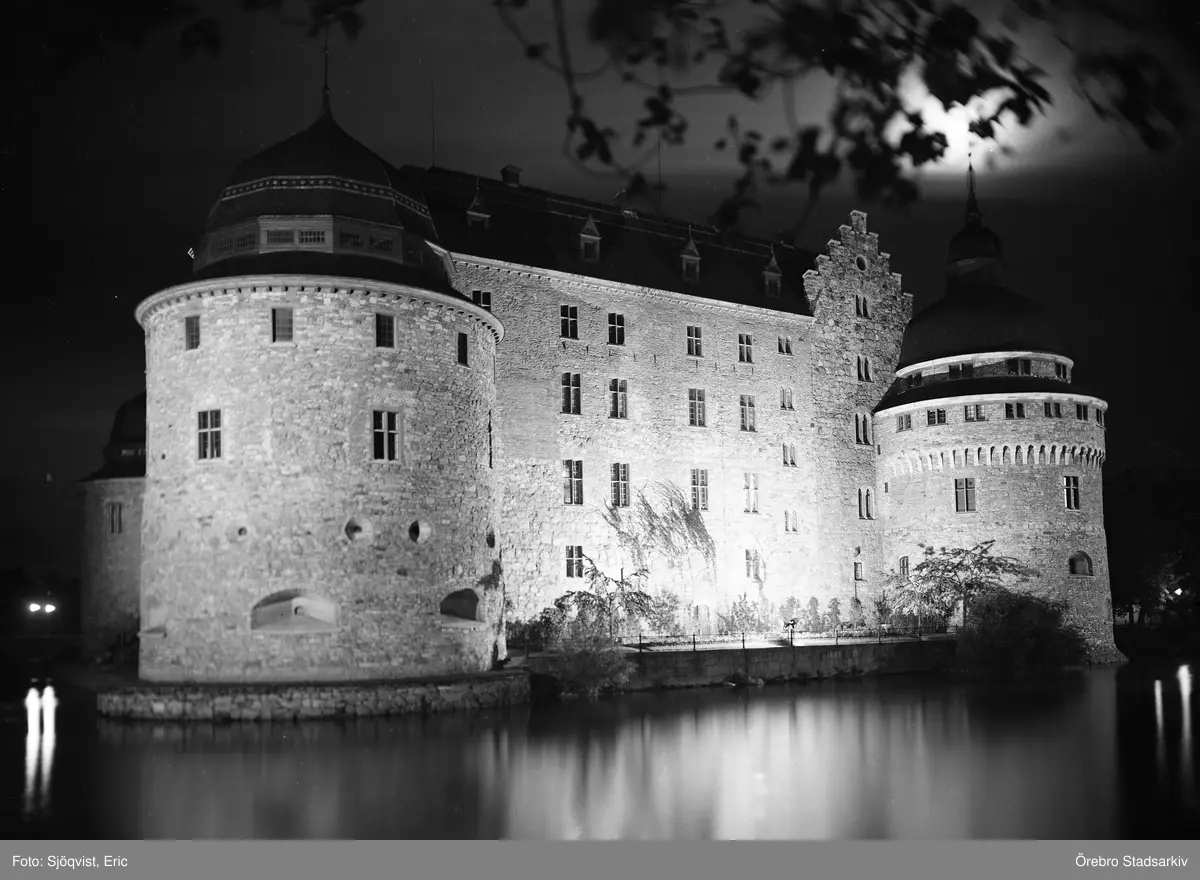Örebro Slott i månljus sett från Storbron, 1930-tal
