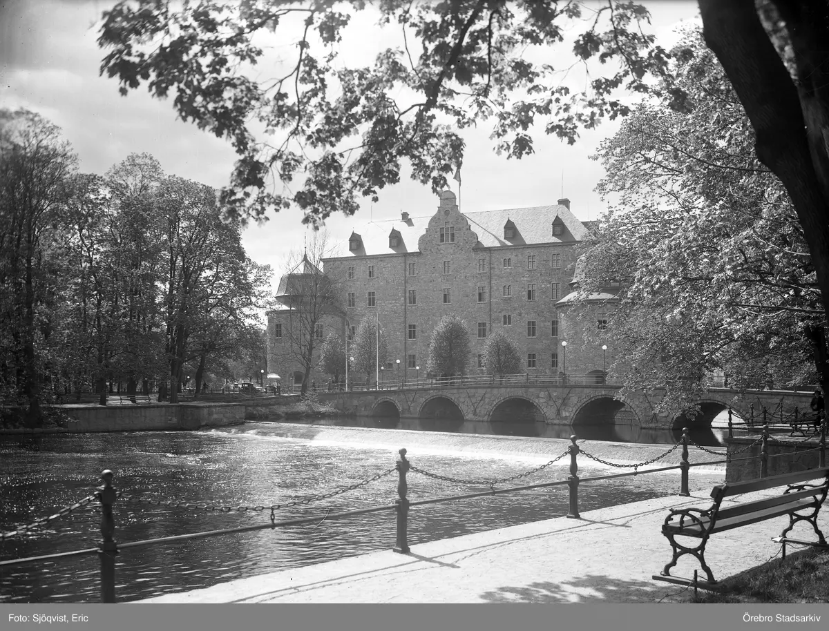 Slottsparken, kanslibron och Örebro slott ses från centralparken, 1930-tal