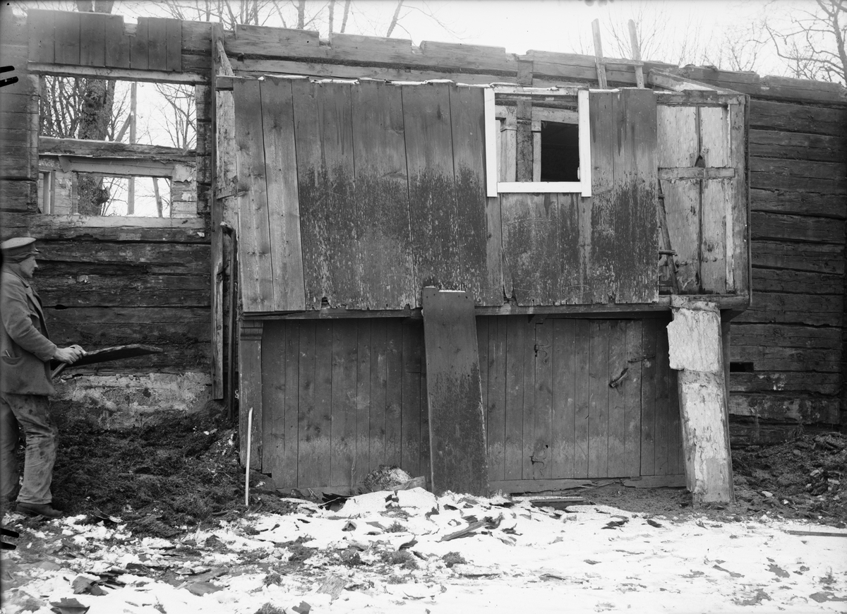 Titel: Helgdagsstugan - nu på friluftsmuseet Disagården - under nedmontering i Gränby, Björklinge socken, Uppland