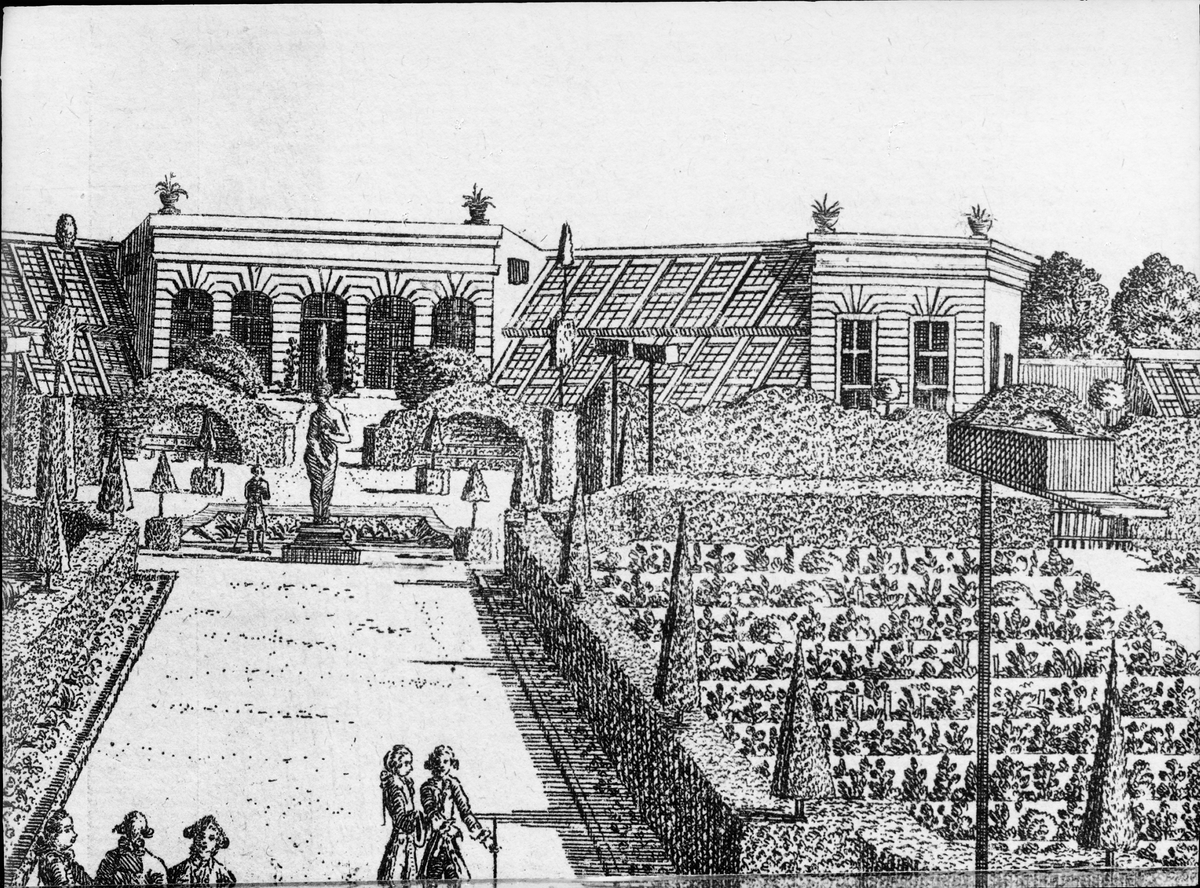 Konstverk föreställande Linnéträdgården med orangeriet och apbur