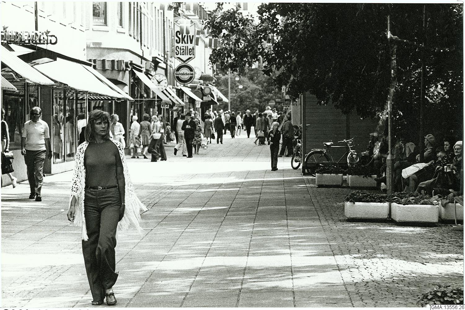 Sträckningsbild längs Korsgatan med butiker, med blick mot söder.