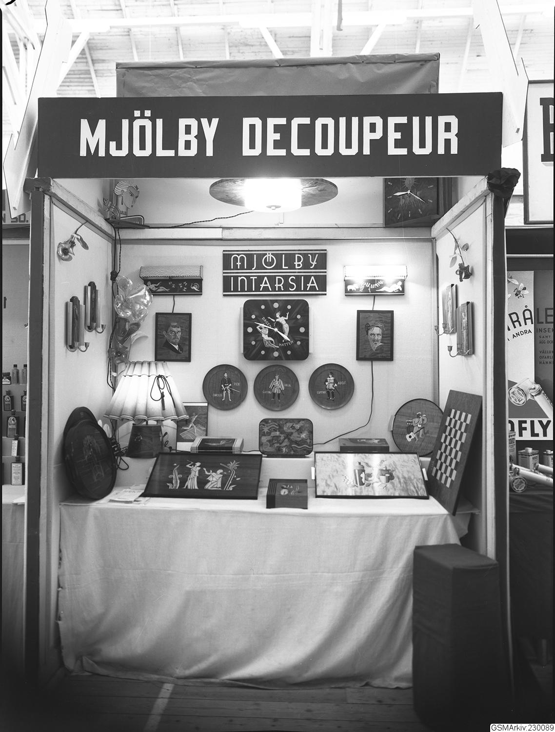 Svenska Mässan vid Korsvägen, Mjölby Decoupage, Mjölby Intarisa visar brickor, lampor mm med dekorativa inläggningar i trä.