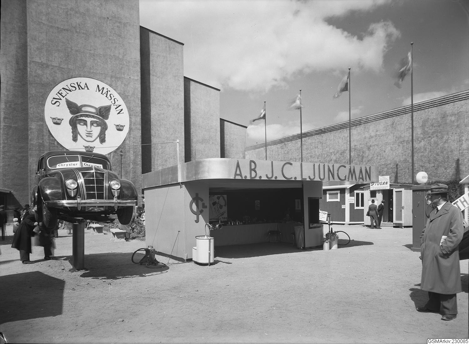 Svenska Mässan vid Korsvägen, Järngården. AB C. L. Ljungmans monter formad som bensinstation med bensinpumpar luftrycksmätare och och andra tillbehör. Tillhöger syns utställning med fritidshus och bodar.