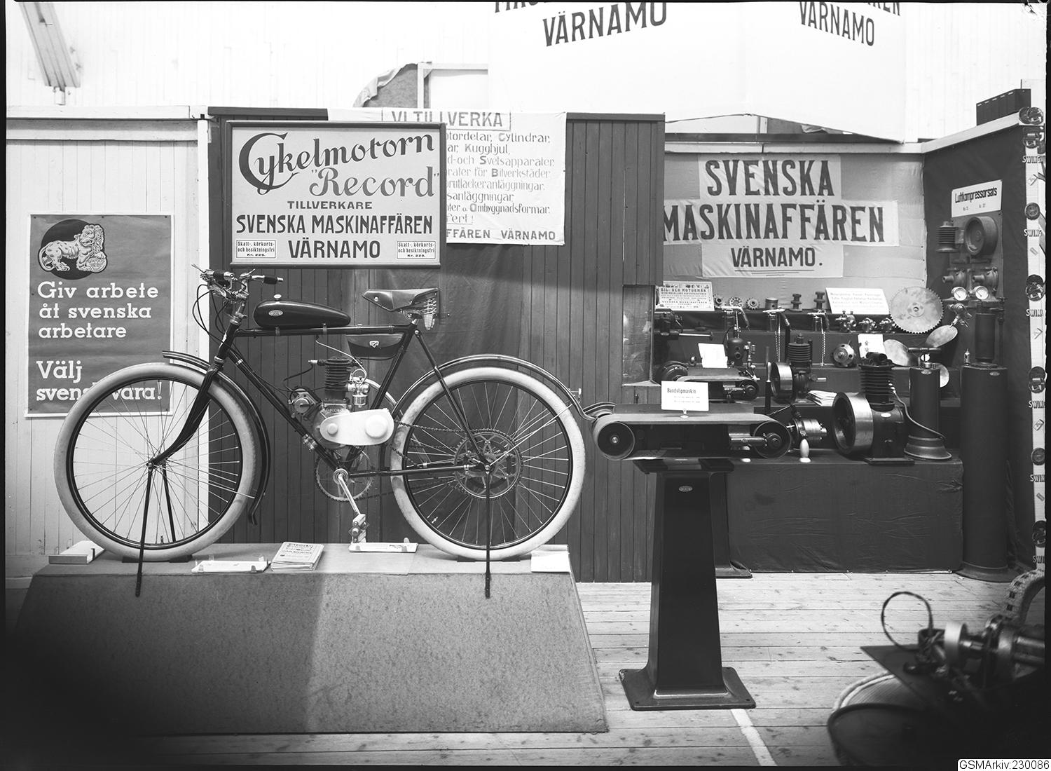 Svenska Mässan vid Korsvägen, Svenska Maskinaffären, Värnamo, ett verkstads- och handelsföretag som starade med cykeltillverkning men kom att tillverka även Cykelmotorn Record samt maskiner, maskindelar och kugghjul med mera.