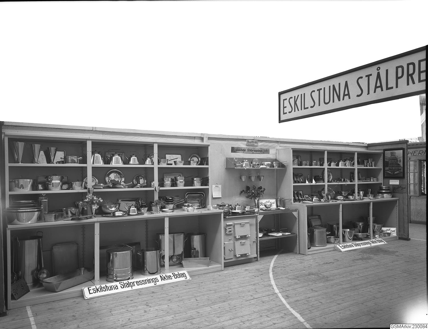 Svenska Mässan vid Korsvägen, Eskilstuna Stålpressnings AB, montern visar hushållsartiklar i det då nya materialet rostfritt stål. Tillverkningen med rostfrit stål staratade 1933.