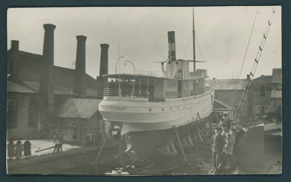 Vykort: Varvet på Forsviks bruk. Kanalångaren Primus på slipen.