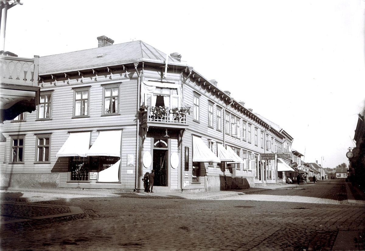 Ur byggmästare Johannes Nilssons fotoalbum från 1914. Vy över fastigheten där Oscar Pehrsons speceriaffär, OP:s kallat, låg i korsningen av Kungsgatan-Norrgatan, kv Lagmannen. På skyltfönstren görs reklam för bland annat ångrostat kaffe, viner och konserver. I samma byggnad låg vid Norrgatan två skrädderier, både systerns Augusta Pehrsons och Jean Svenssons.