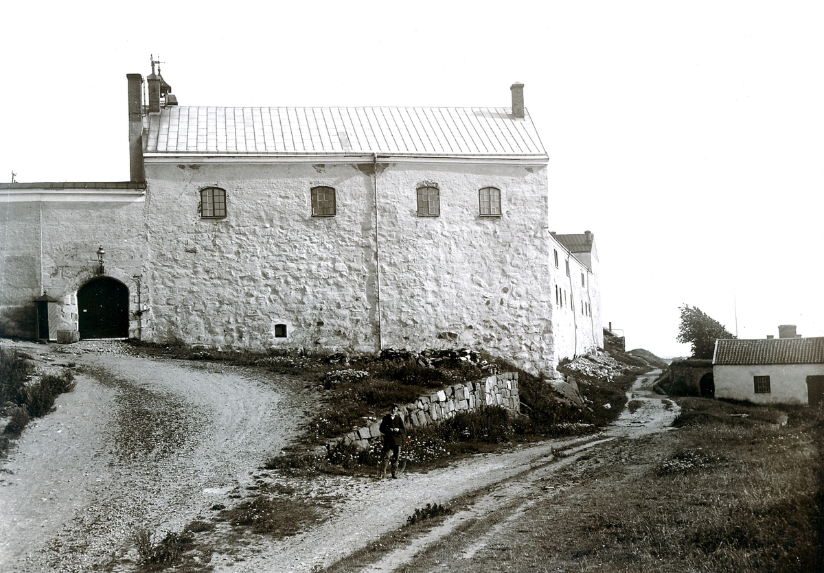 Ur byggmästare Johannes Nilssons fotoalbum från 1914. Norra sidan av den medeltida borgen, även kallad Varbergs slott, som greve Jakob uppförde 1287-1300. Till vänster om den stängda porten står en vaktkur.