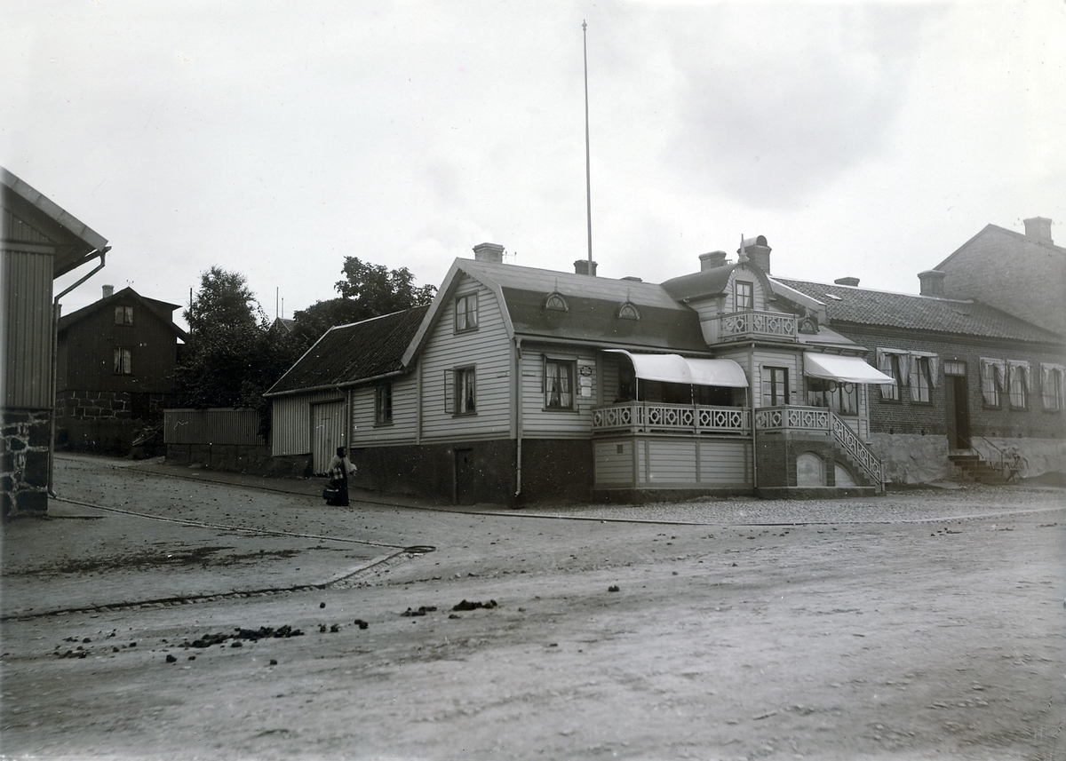 Ur byggmästare Johannes Nilssons fotoalbum från 1914. Byggnad som troligen är uppförd efter 1865 i korsningen Västra Vallgatan-Engelbrektsgatan. 1931 etablerade Gustav Hesselgren Hemgårdens pensionat och resanderum här i kv Berget, nära järnvägsstationen. Här drevs ända fram på 1970-talet restaurang Hemgården.