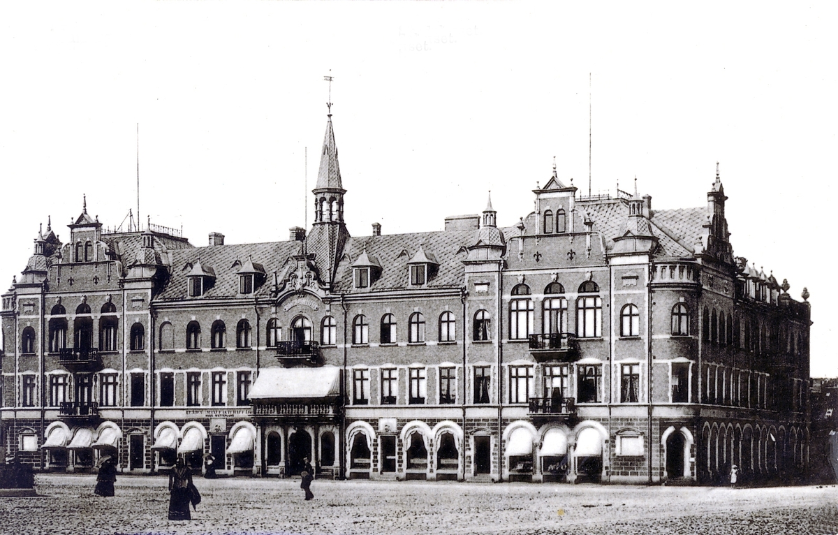 Ur byggmästare Johannes Nilssons fotoalbum från 1914. Varbergs stadshus och -hotell uppfört 1902 vid Kungsgatan längs torget under Nilssons ledning utifrån arkitekt Ola Andersons ritningar. Initiativet till byggnaden togs av politikern och organisten Alfred Lundgren som lämnade in en motion till Stadsfullmäktige 1898 om ett stadshotell. Med butiker i gatuplan skulle det kunna bli inkomstbringande, menade han och huset borde även rymma en stor festsal för olika möten och evenemang. Ingenjör Hugo Gerlach, ordförande i Stadsfullmäktige, såg till att stadens första offentliga elverk installerades i källaren.