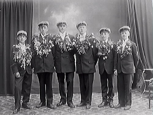 Realexamen. Sex pojkar i studentmössor med buketter om halsen.
