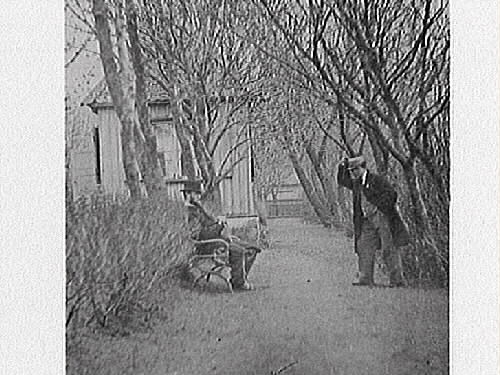Avfotograferat visitkort, (1870-tal). Herr Baumgarten, sittande och fotograf Birger Sjöberg stående vid en liten kioskliknande byggnad. Birger Sjöberg hade ateljé, troligen i fastigheten kallad "Wallmanska", utmed Västra Vallgatan i Järnvägsparken. (Se VMÅ 1989 s 21: artikel av Eva Berntsson Melin) Möjligen är bilden tagen där.