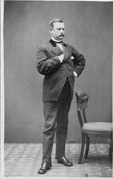 Ateljéfotografi av Fritz Ljunggren i helfigur med höger hand instoppad i kavajen likt Napoleon.