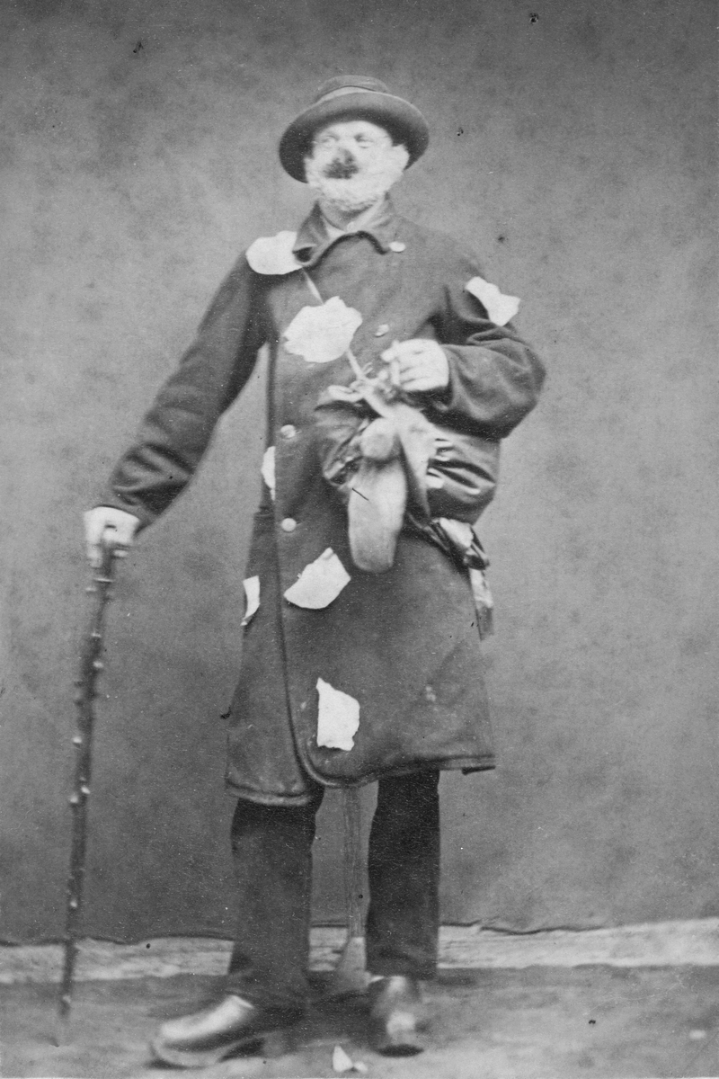 "Möller". Ingår i August Bondesons arkiv och samhör med bildnr VMA11730_7_15 som är fotograferad av Sjöberg. Tiden satt utifrån Birger Sjöbergs verksamhetstid i Varberg. Utklädd man i rock med stora lappar, lösskägg och -näsa, käpp och under armen en säck, i handen en cigarr. Troligen någon aktörs rollkaratär i revy eller liknande. Meddela oss gärna om du känner till mer om denne man!
