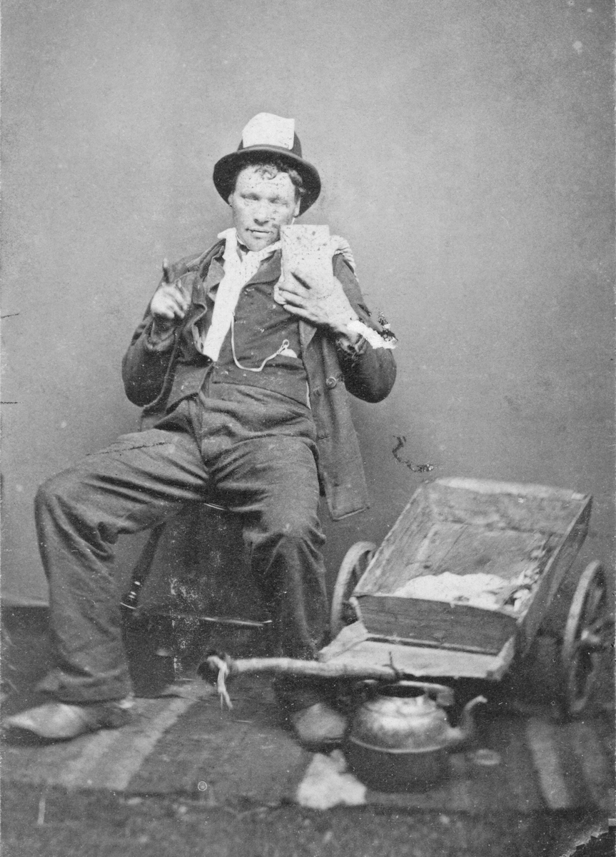 "Möller". Ingår i August Bondesons arkiv, samhör med bildnr VMA11730_7_16. Tiden satt utifrån Birger Sjöbergs verksamhetstid i Varberg. "Sjavig" man med bok och cigarr vid liten kärra med kaffepanna och i hatten ser en lapp ut att sitta. Troligen någon aktörs rollkaratär i revy eller liknande. Meddela oss gärna om du känner till mer om denne man!