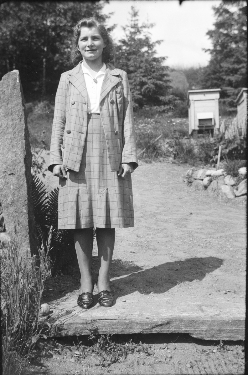 Ella Lundgren står i rutig kjol och jacka vid en högsmal sten och bikupor vid granarna bakgrunden.