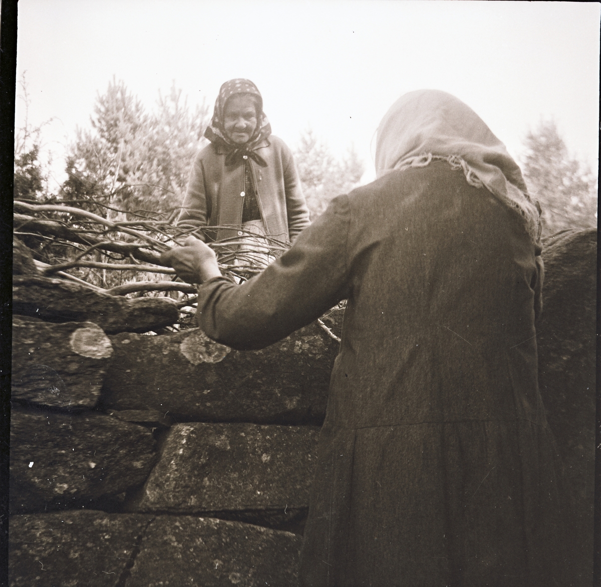 Kloare- eller Kloar-Inger och Fållse-Maria, vänd hitåt, sysslar med kvistar vid en stenmur. Båda bär hucklen.
