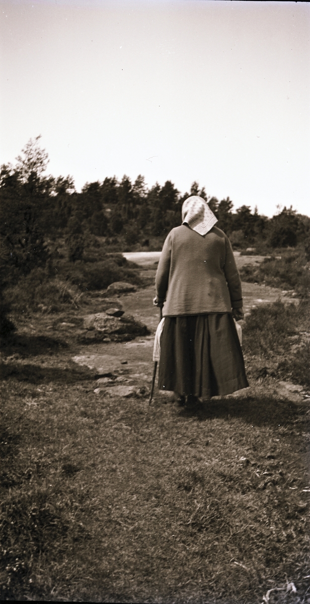 Fållse-Maria går med käpp över den steniga stigen fram mot vägen. Hon är klädd i hyckle, kofta och lång kjol.