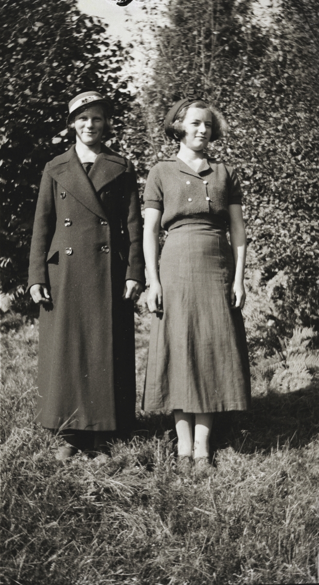 Anna och Alice Snygg ute i naturen. Båda bär hatt men Alice har en lång kappa medan Anna har kortärmad jumper och kjol.