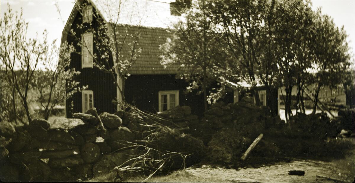 Bostadshuset på Snyggs gård i Järlöv, Vedige, sett från stengärdsgården på baksidan. Det brutna sadeltaket är belagt med stickspån (pärt).
