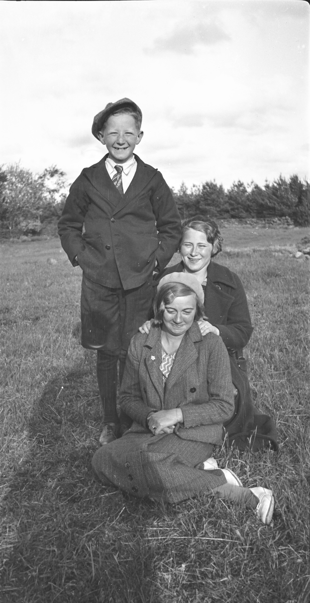 "Målarns Gustav" står med Selma och "Utmosse-Signe", som sitter ute i gräset. Kvinnan längst fram har en majblomma på kragen. (Målarns Gustav även på bildnr EA0363)