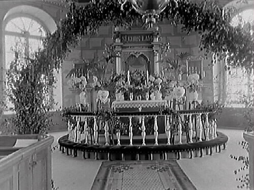 Interiörbild av Horreds kyrka. Koret med altarring och altaruppsats sett genom en lövad ärebåge. Korväggen har kvadermålning.