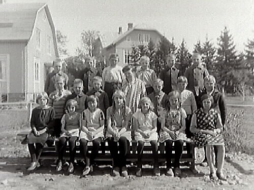 Skolfoto utanför skola i Grimeton med skolfröken Nilsson i mitten.