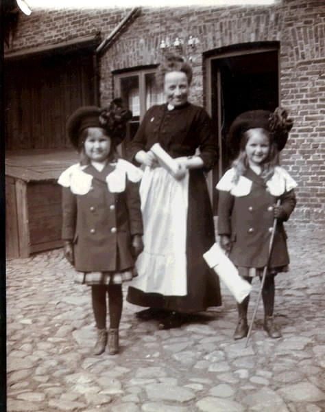 "Ett hörn av Monarks gård". Linda Hanson med flickorna Maud Jobson och Daisy Jobson, systrar till Arthur Jobson; barn till Donald och Anna Jobson. Bilden ingår i samlingen om Firma Linda Hanson.