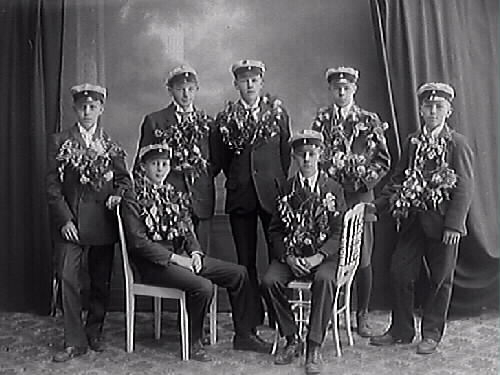Realexamen. Sju pojkar i studentmössor med buketter om halsen, ateljéfoto.