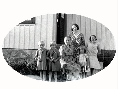 Augusta Karlsson på Tvååker 12:12 med barn och barnbarn. Augusta sitter i mitten med döttrarna Karin (Ingeborg) Karlsson längst till höger och Annie (Linnea) Elofsson baktill, kallad Anny. Flickan till höger om Augusta heter Margit "Maj" Johansson och var fosterdotter hos Augusta mellan 1-5 års ålder. De två flickorna till vänster om Augusta är döttrar till Anny och maken Victor Daniel Elofsson.