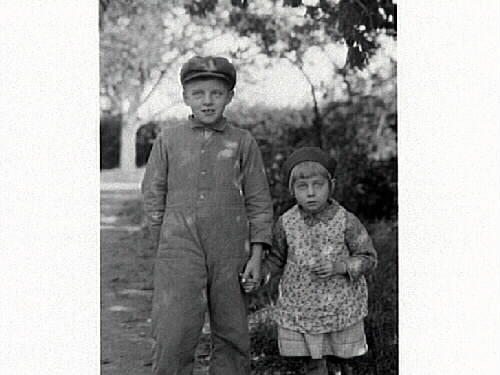 Barnen Karl Hugo Svensson och Maj Johansson. De var fosterbarn hos "Kura-Augusta", Augusta Karlsson på Tvååker 12:12. Karl Hugo har keps och overall på sig. Maj bär mössa och blommigt förkläde utanpå kjol och blus.