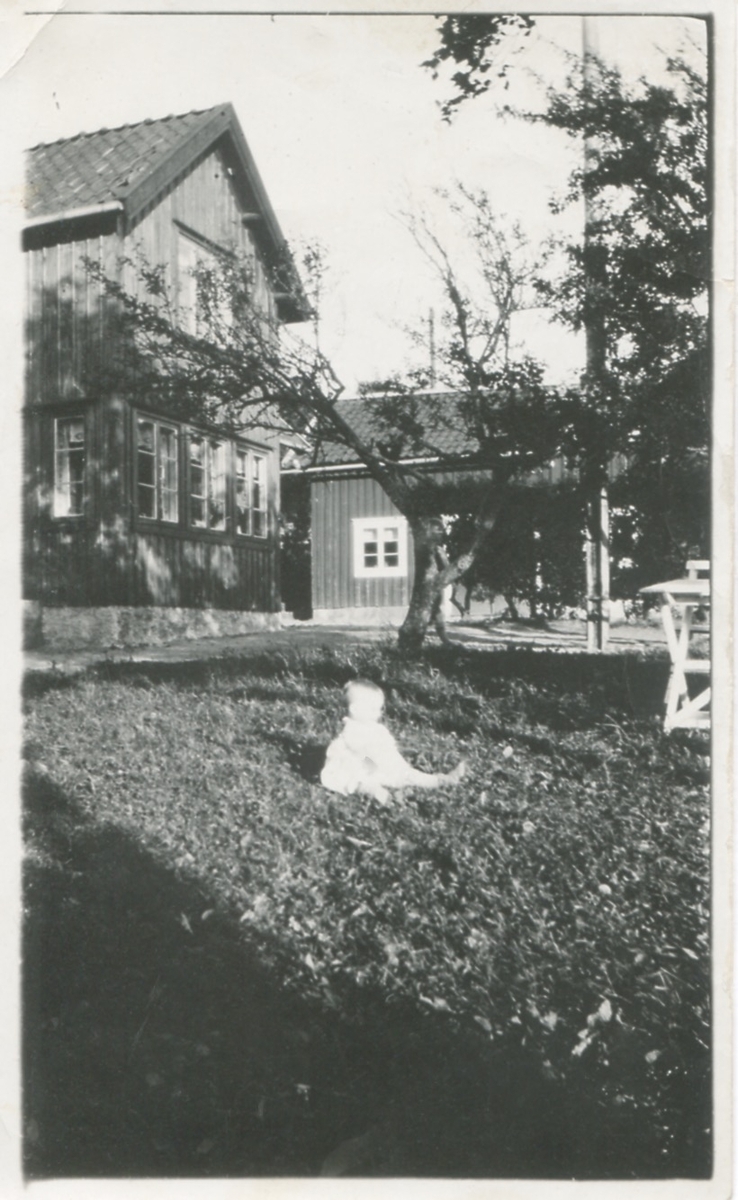 Ett litet barn sitter på gräsmattan vid "Birgers" (nedre gården), Backen eller Högen i Kållered.