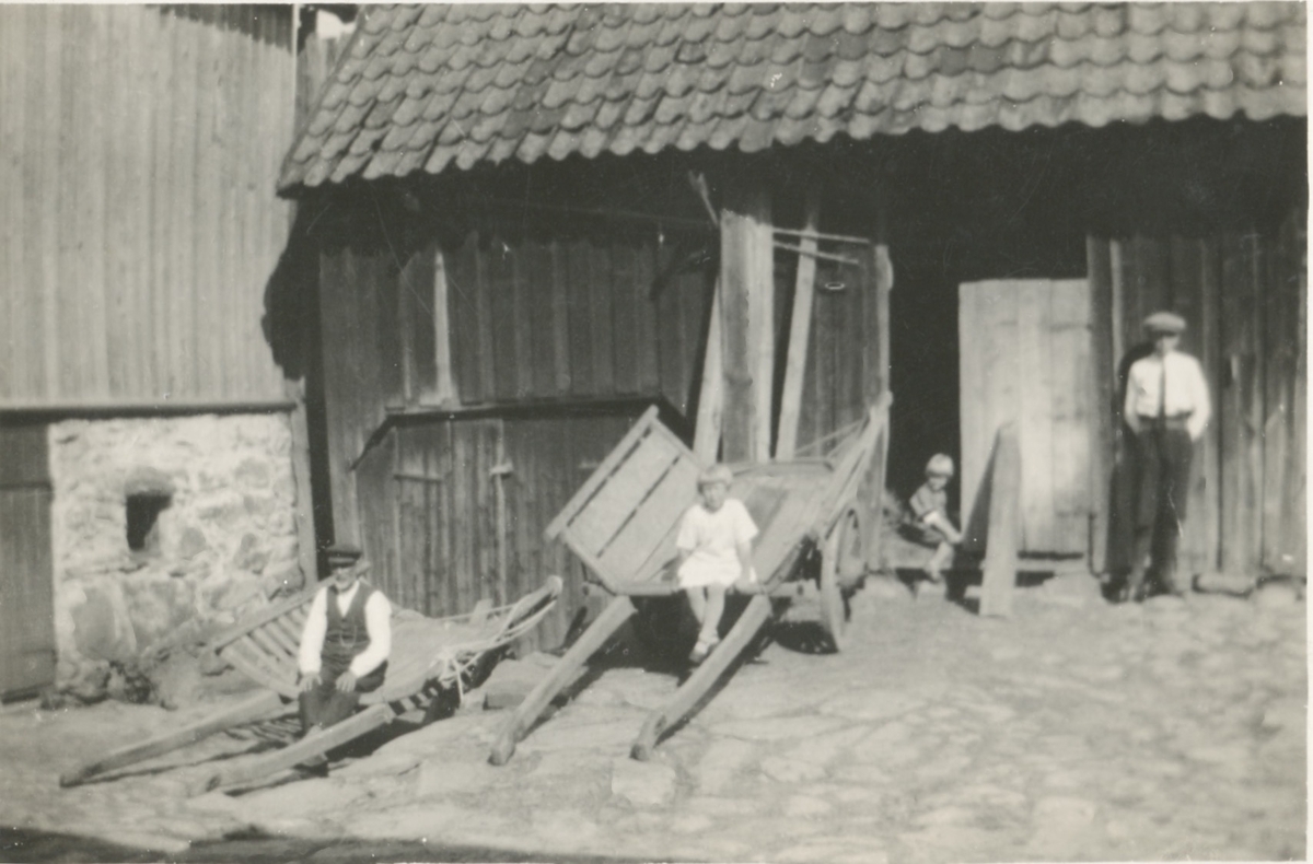 Några personer befinner sig utanför en ekonomibyggnad, Backen eller Högen "Alfreds" (övre gården) i Kållered okänt årtal.
