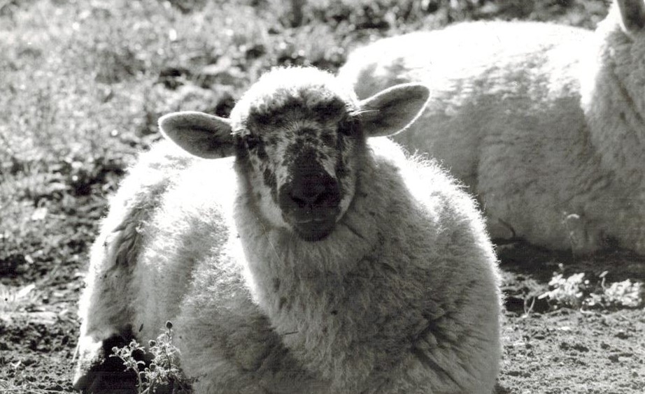 Två får ligger på åkern vid Labacka Lund (idag: Labacka 1:19), cirka 1965.