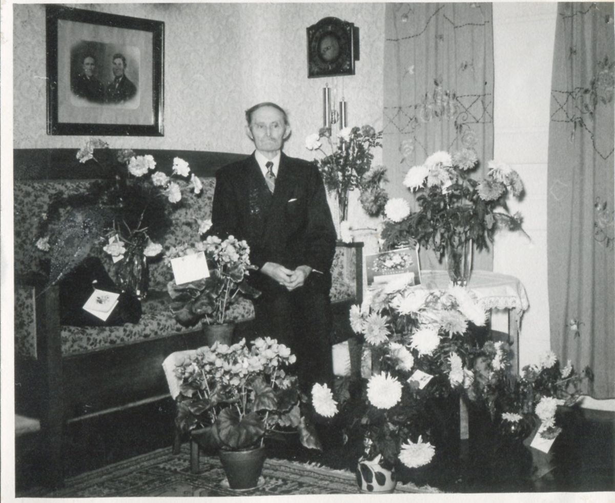 Uppvaktning för Axel Eriksson (1877 - 1958), Heljered Mellangård 1:2 "Store Börjes", okänt årtal. Axel sitter i soffan. Relaterat motiv: A3910.
