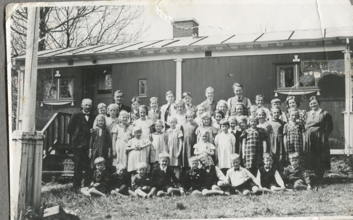 S. Missionskyrkan. Missionsförsamlingens söndagsskoleutflykt med barn födda 1925 - 1935, okänd plats och årtal. Till vänster: Gustav Johansson, söndagsskollärare. Till höger: Svea Johansson, söndagsskollärare.