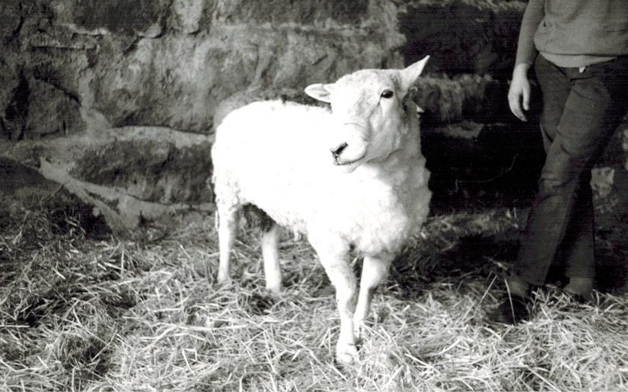 Ett får står på ströhalm framför en stenvägg (lada), Labacka Lund (idag: Labacka 1:19), cirka 1965. En man kommer gående från höger sida mot fåret.