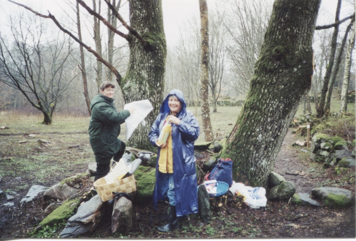 Livered Kulturskola 2000-04-15. SV Mölndals kulturskola. Poängpromenad för mellanstadieelever. "Vätskekontroll" vid Livered damm, natur- och kulturstigen i Livered. Från vänster: Ingela Nilsson och Gun Flygare, båda anställda av SV Mölndal (studiecirkelförbundet Vuxenskolan).