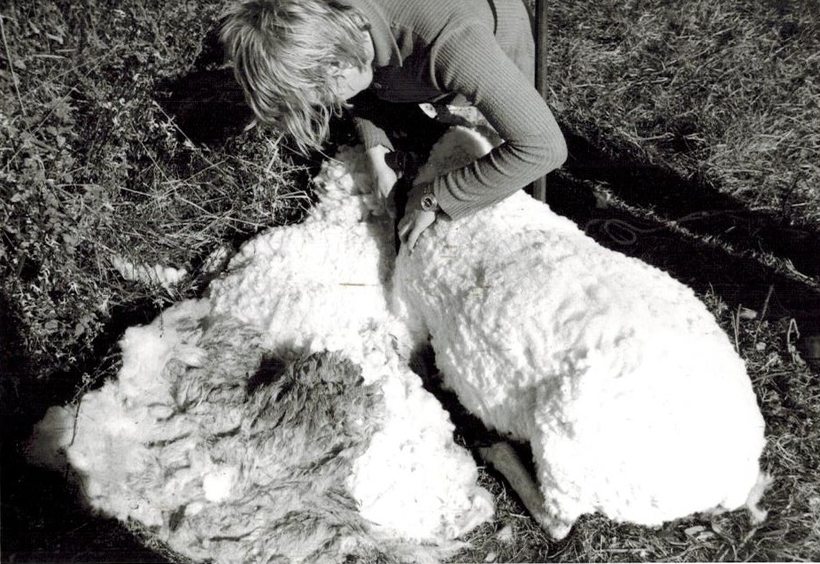 Ingemar Johansson (född 1956) klipper ett får som ligger på marken, Labacka Lund (idag: Labacka 1:19), cirka 1965. Till höger ses den avklippta pälsen som senare ska bli till ull.