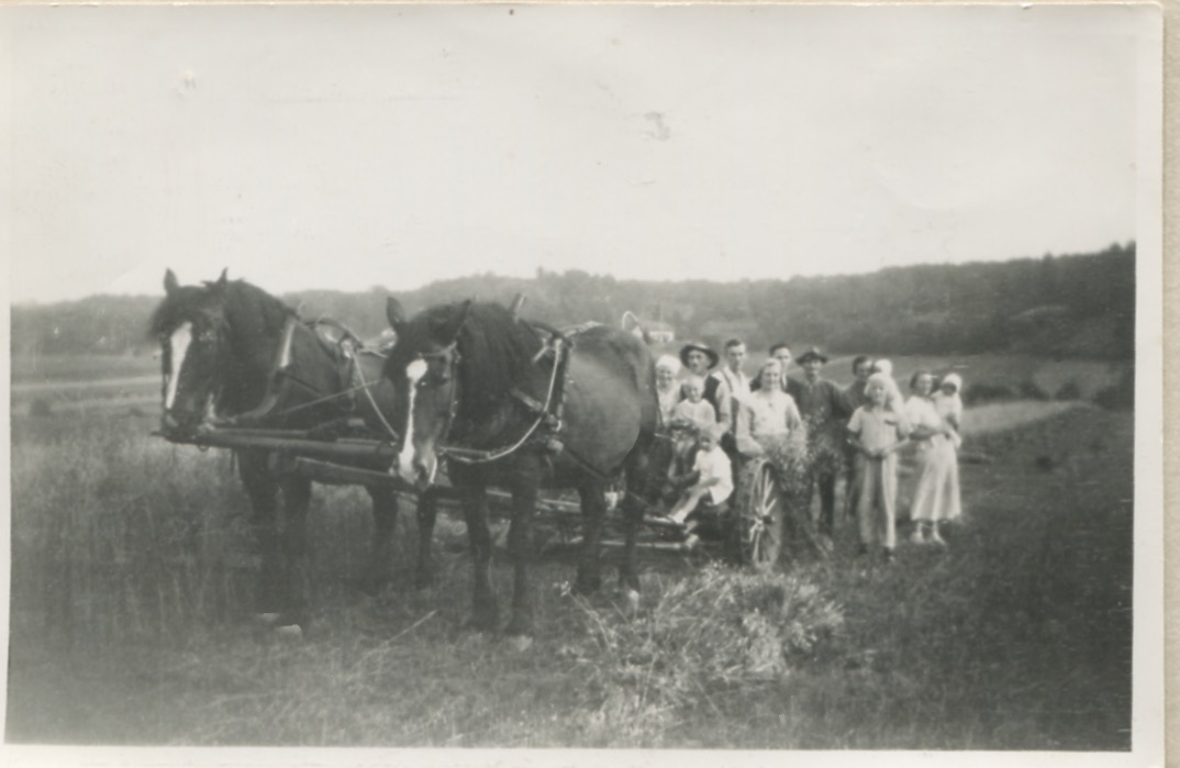 Axel Eriksson (1877 - 1958) och sommargäster står ute på åkern med två förspända arbetshästar, "Store Börjes" Heljered Mellangård 1:2 1930-tal.