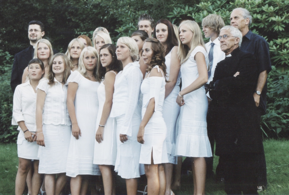 Konfirmationsdeltagare och präst står utanför Kållereds Missionskyrka (senare Ekenkyrkan) år 2003.