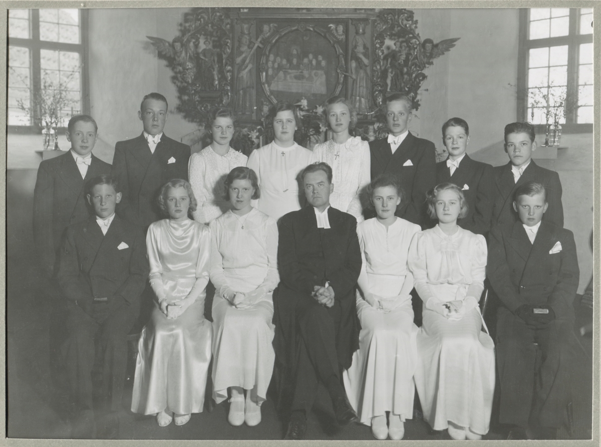 Konfirmation med Komminister Olle Karlne (1900 - 1976) i Kållereds kyrka före 1925.