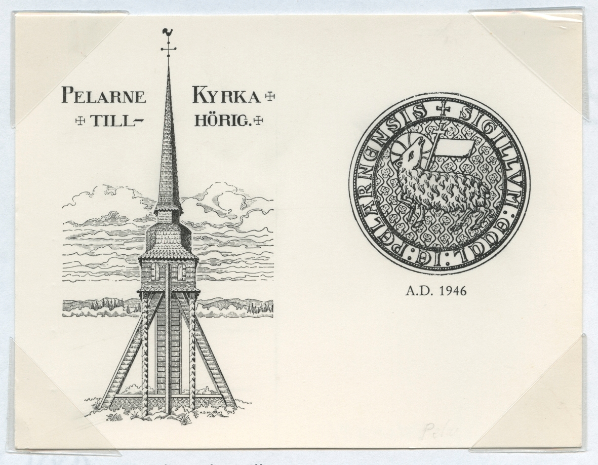 Kort med motiv av klockstapeln vid Pelarne kyrka.