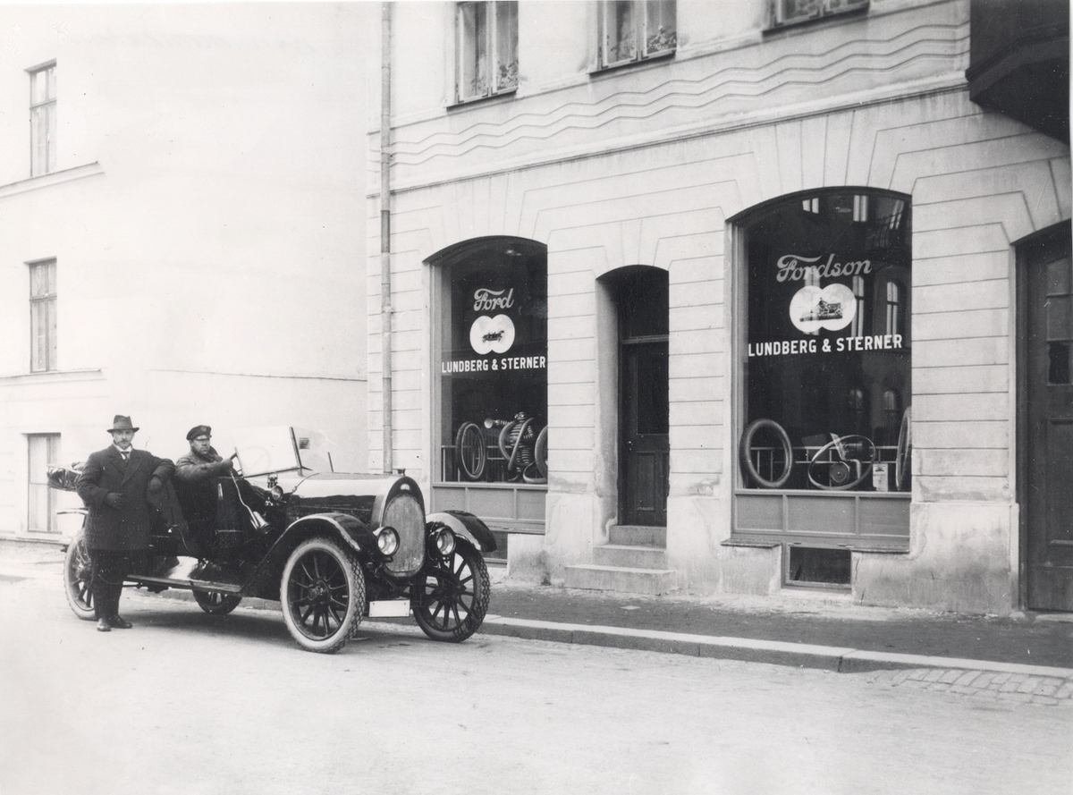 Bilfirma som säljer Ford och Fordson, framför skyltfönsterna står en bil med två män.