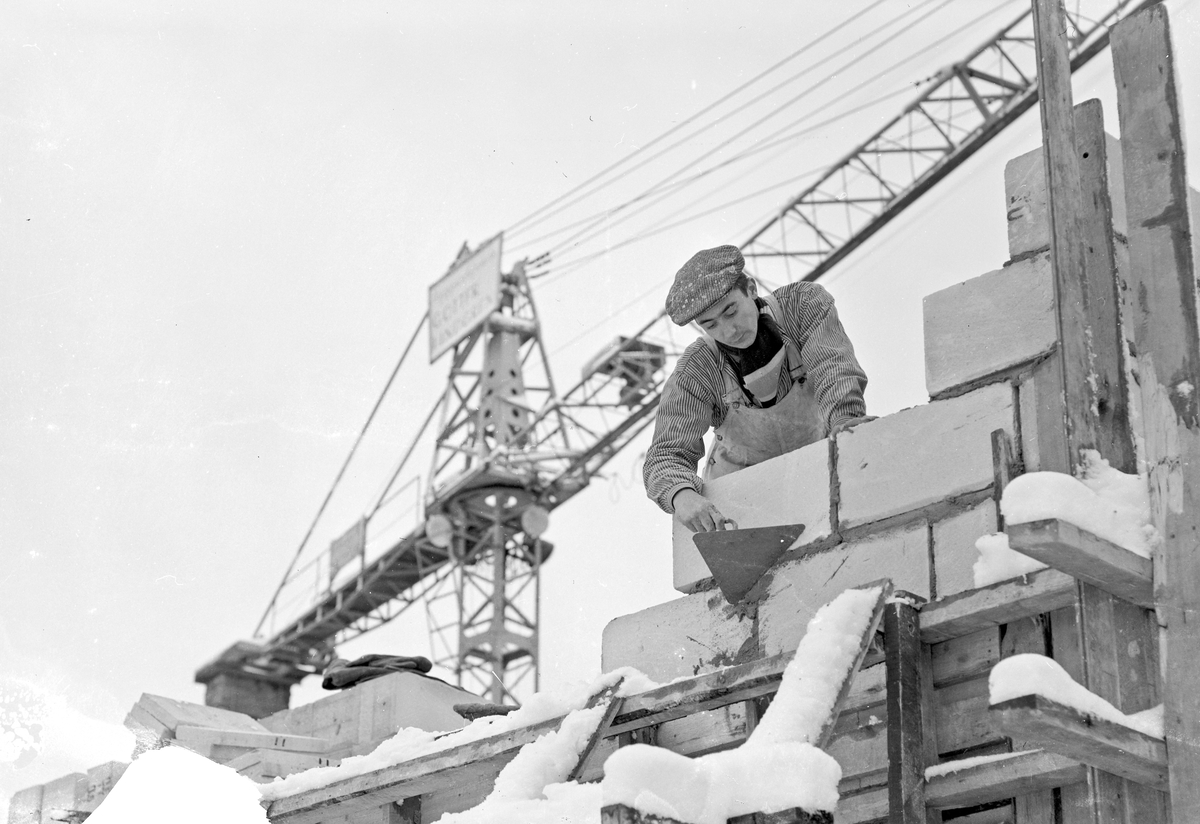 Byggarbetare från Gottfrid Lindberg murar en vägg