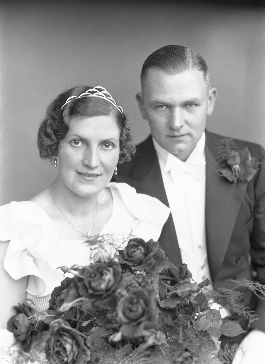 Brudparet Sterley, c/o Björk, Södra Kungsgatan 13, Gävle. Den 10 augusti 1935.