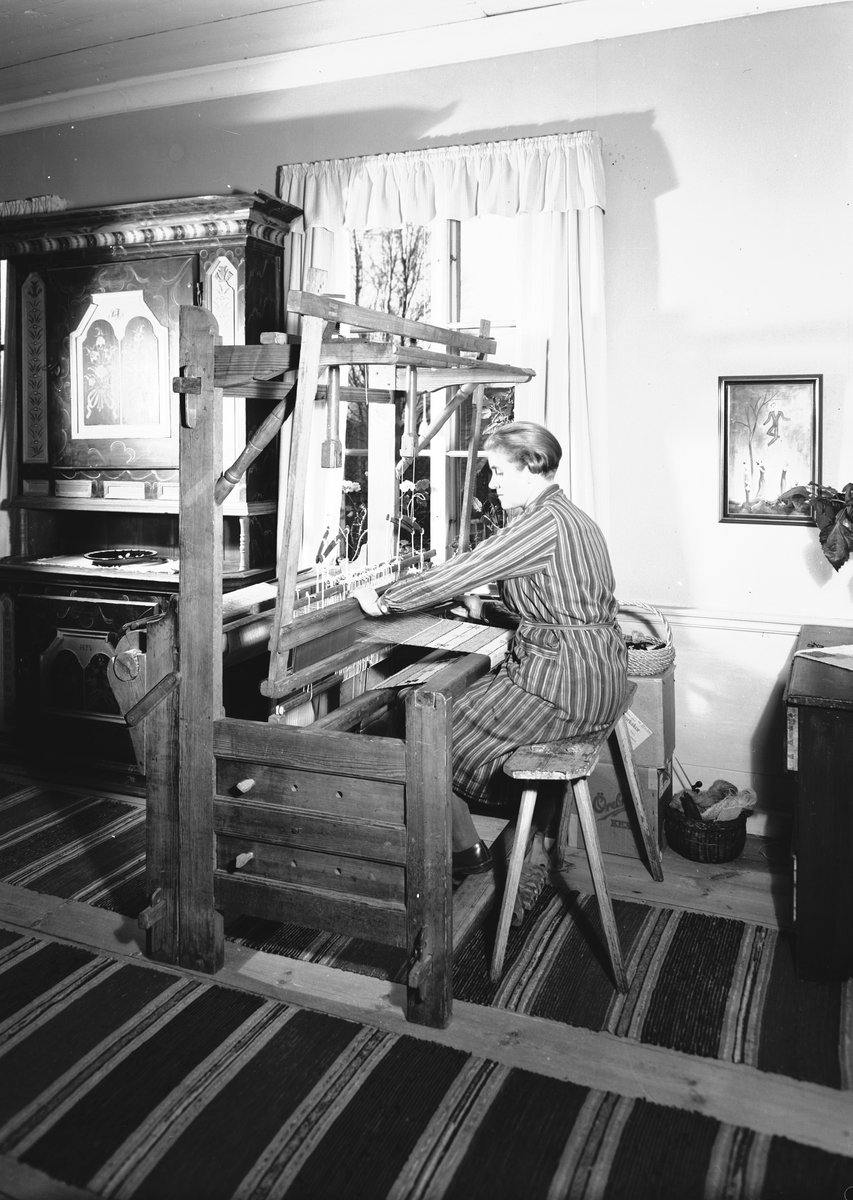 Från boken "Svenska Hem i ord och bilder" från 1944. Hemma hos Konstnären Manne och Brita Östlund, ägare till Jons i Västbyggeby. Fru Brita Östlund vid vävstolen. Till vänster ett mörkblått Järvsöskåp med röda speglar från 1825.